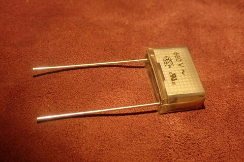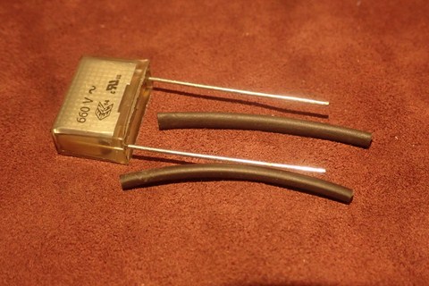 660 volt version with long connections, including heat shrink tubing. This way it is possible to solder the terminals and place the capacitor as shown in the picture.
