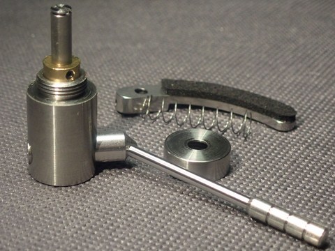 1 il corpo centrale interno, realizzato in ottone, presenta 3 fori filettati con grani, attraverso i quali è possibile regolare in altezza il perno centrale in acciaio inox ( pistone centrale)