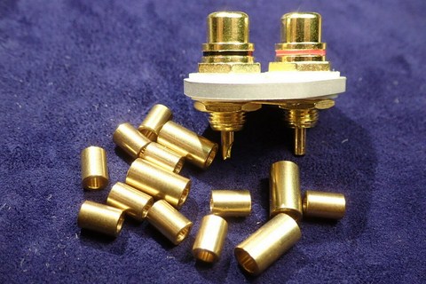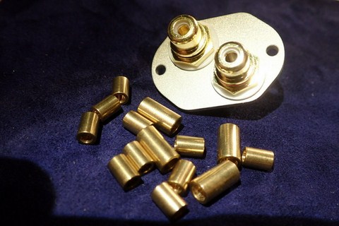 PLACCA DI ALLUMINIO SPESSORE 3 MM REALIZZATA A CONTROLLO NUMERICO E POI SABBIATA+ 2 RCA IN OTTONE PLACCATO IN ORO+ 12 CILINDRI IN OTTONE. ATTRAVERSO QUESTA PIASTRA è POSSIBILE RIMUOVERE L ATTACCO IN PLASTICA ORIGINALE A PETTINE E MONTARE POI QUALSIASI COPPIA DI RCA.