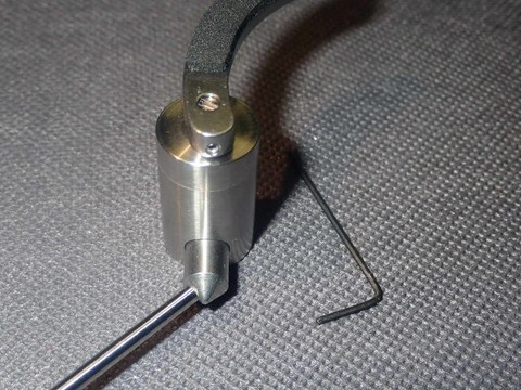 The central pin (central piston) supporting the arm rest has a threaded upper hole with a slotted head machine screw, as standard the screw is totally screwed in. By slightly loosening the lateral grub screw of the arm rest it is possible to undo the upper screw for a total of 2.5 turns resulting in a maximum excursion of about + 1.3 mm. This way it’s possible to adjust the height of the central piston and therefore the height of the cartridge with respect to the vinyl. 1.3 mm of arm rest height is equivalent to about 5 mm of adjustment of the cartridge
