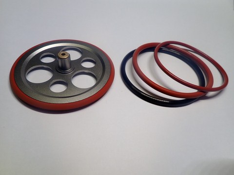 Esclusive to this Limited Edition are beadblasting and anodizing treatments. Besides, through the use of an oversized liquid silicone o-ring bonded to the wheel, the ultimate expression of the V line idlerwheel is achieved by grinding: a wheel that exactly replicates the original Lenco profile, for the first time out of silicone.