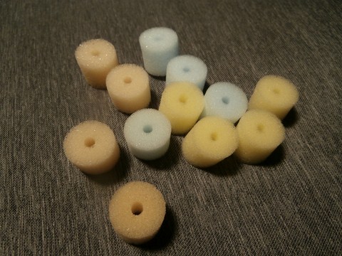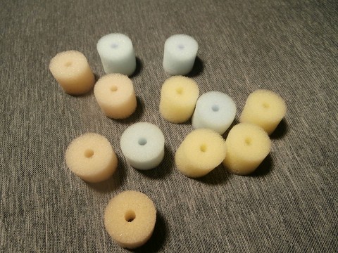 We offer three sets of circular sponges to dampen spring vibrations. The cream colored set is an exact replica of the original sponges. The other two have different density: yellow indicates medium density, blue is for high density. We decided to produce two additional sets of dampers to compensate for the different behavior of the springs, which over time tend to loose their original properties. A higher density corresponds to better oscillation control.