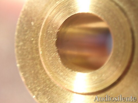 Made of Avional aluminum, the new design comes with an increase in weight, now identical to that of Thorens original wheel, which improves rotational stability. The bushing housed inside is machined from sintered bronze cylinders pre-impregnated with oil. Moreover, each bushing is bored using reamers manufactured to Audiosilente specifications and finally polished with special ceramic brushes that allow for a perfect finish of the bore.