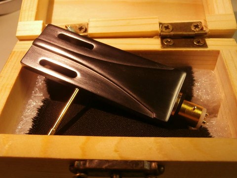 Posteriormente viene inserito un collare in alluminio che permette con l'uso di un grano la regolazione dell'azimut. Il lift è realizzato in ottone placcato oro 24 K . 7 micro. Il connettore eia viene realizzato in ottone e poi placcato in oro con doppio trattamento 24 k . Viene interamente realizzato a controllo numerico e poi assemblato manualmente uno ad uno. La qualità del connettore eia Audiosilente è riconosciuta a livello mondale, molte aziende che producono shell hanno deciso di utilizzare il nostro connettore per la realizzazione dei loro shell. I fili di connessione sono realizzati in rame Ofc placcato argento al 20 % rivestiti in teflon, le clips testine realizzate su specifiche Audiosilente sono in bronzo fosforoso, materiale altamente elastico, accettano testine con pin 1.17 1.22 per cui la maggior parte delle testine nuova generazione.