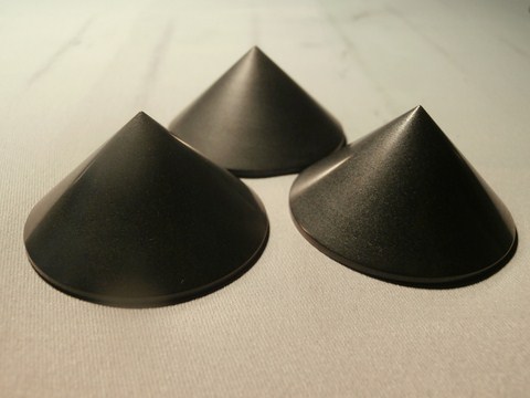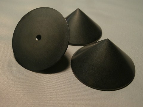 Punta conica in grafite isostatica HDG versione luxury, lucidata a mano. diametro 4 cm altezza 2 cm. Ogni punta è provvista di foro filettato M5. La configurazione ottimale è di 3 punte. Ogni punta può sostenere in abbinamento alla sottopunta in grafite un carico di circa 10 kg.