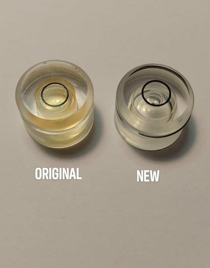Very often, the original spirit level has lost its liquid over time or, as is often the case, the bubble inside has expanded, making it impossible to read. The spirit level also comes with a steel ring and cream-colored cardboard to be applied to the bottom (exactly as in the original). To remove the original spirit level, insert a plastic or wooden cylinder with a maximum diameter of 5 mm into the housing under the frame ad tap it until it comes out. To install the new level, first put the new cardboard on the bottom of its housing and gently press down with your fingers.